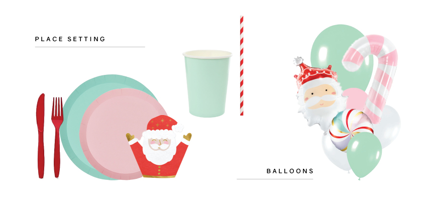 *Five Star Products: Red Plastic Fork and Knife, Pink and Mint Round Paper Plate, Santa Napkin, Mint Paper Cup, PD Santa Head Foil Balloon, Pastel Candy Swirl